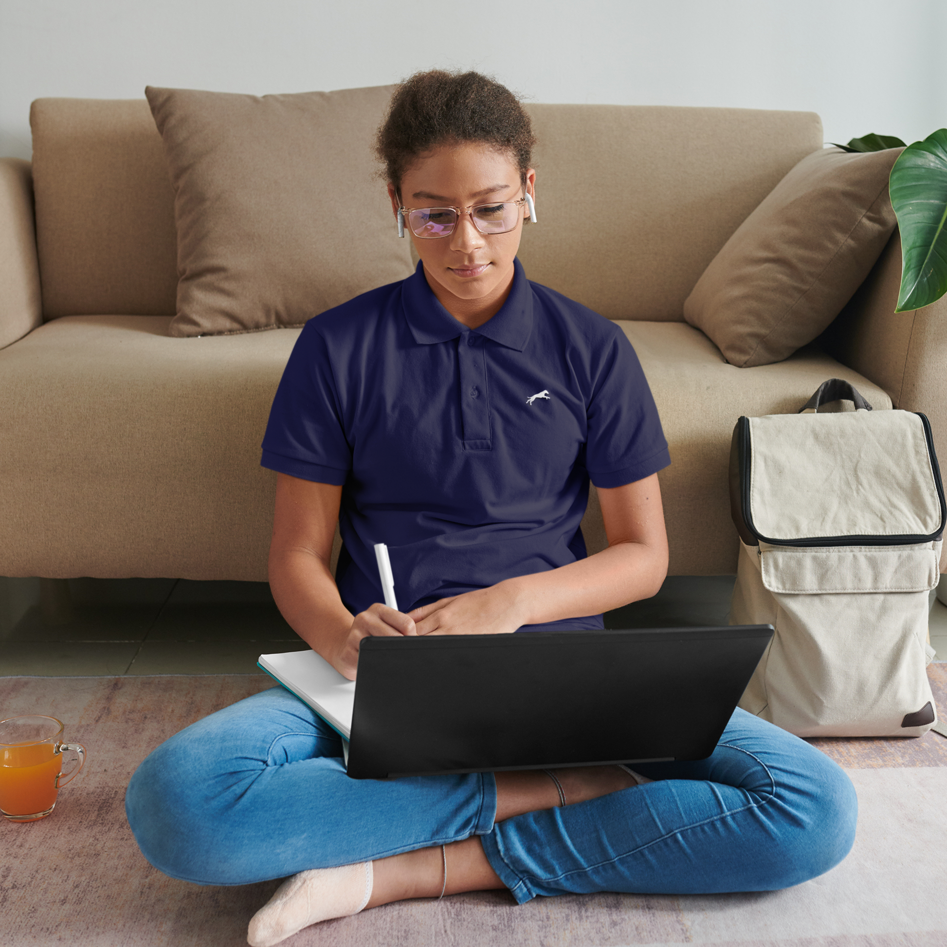 This stylish polo shirt features embroidery of a sleek, galloping sighthound, and is designed for both comfort and sophistication.