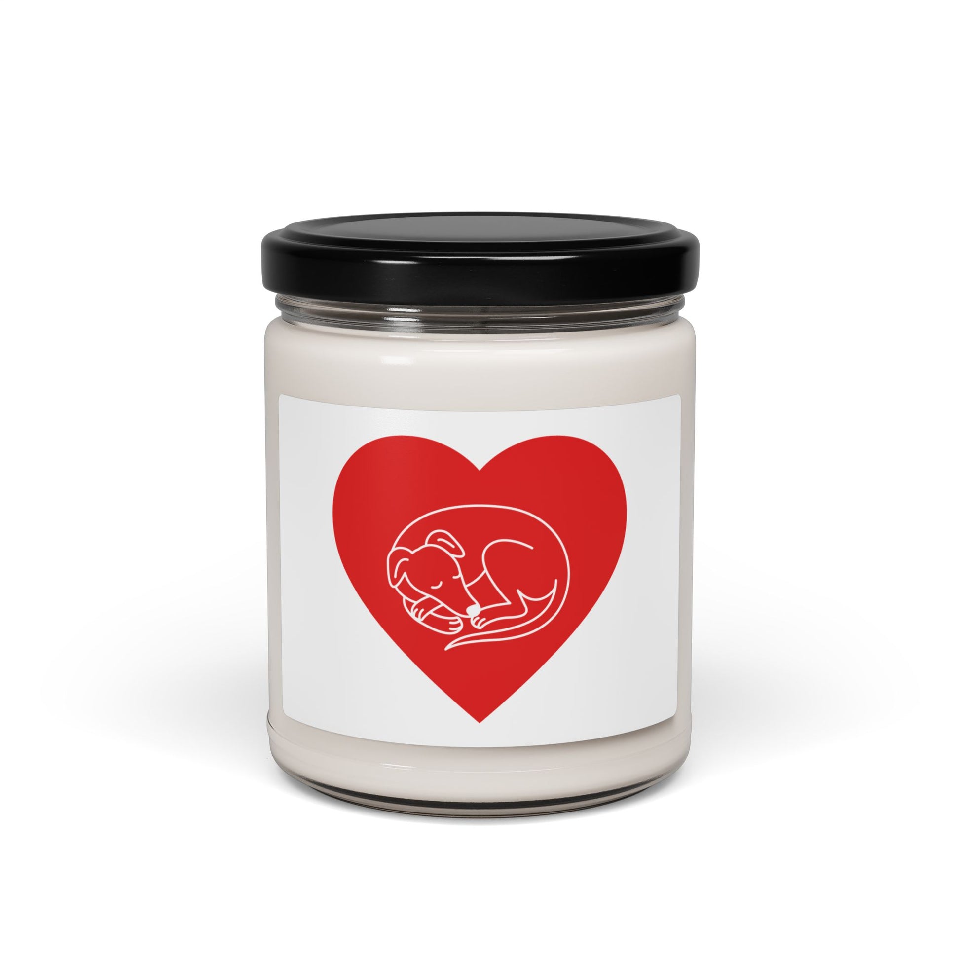 Bring warmth and charm to your home with this scented soy candle. The glass container features a sweet design of a napping sighthound nestled inside a heart. More than just a candle, it creates a comforting atmosphere. Dog lovers will appreciate its design and soothing glow.